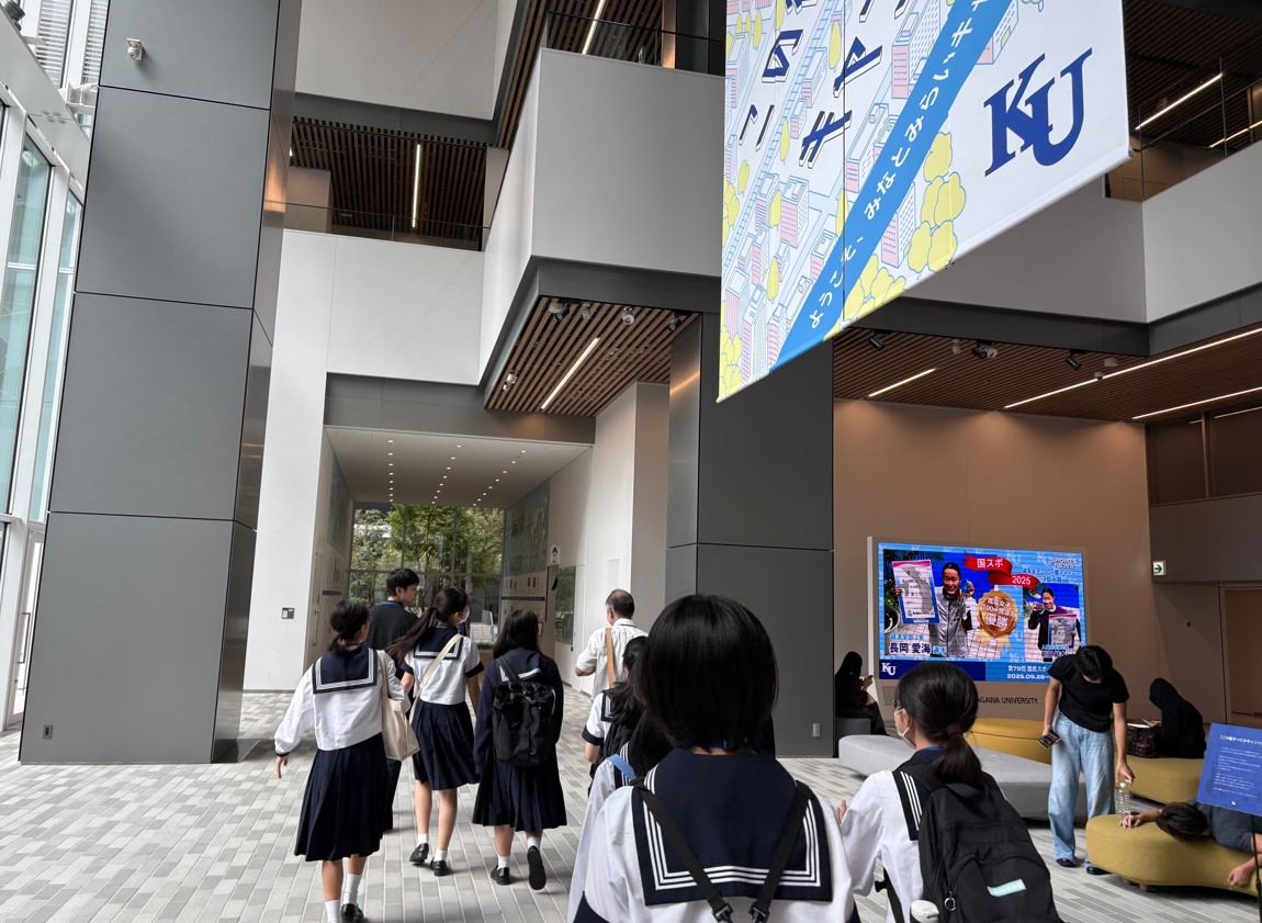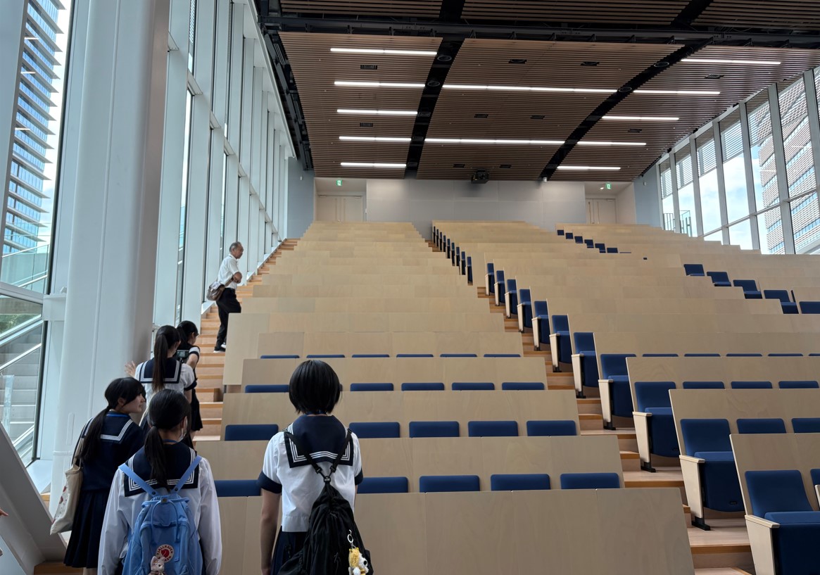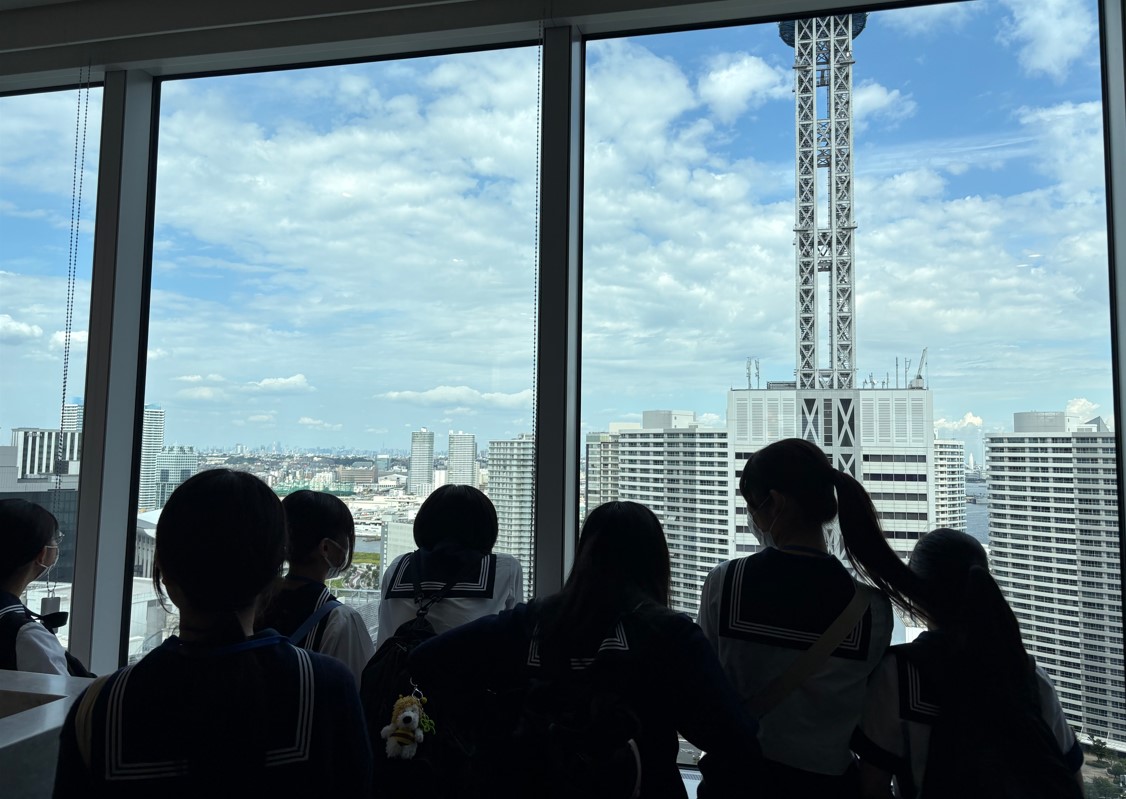 午後は神奈川大学みなとみらいキャンパスを訪問させていただきました。2021年に設立されたばかりの新しいキャンパスで、最上階の食堂や講演会などが行われているホールなどを見学しました。最新の設備に生徒も目を輝かせながら見学をしていました。