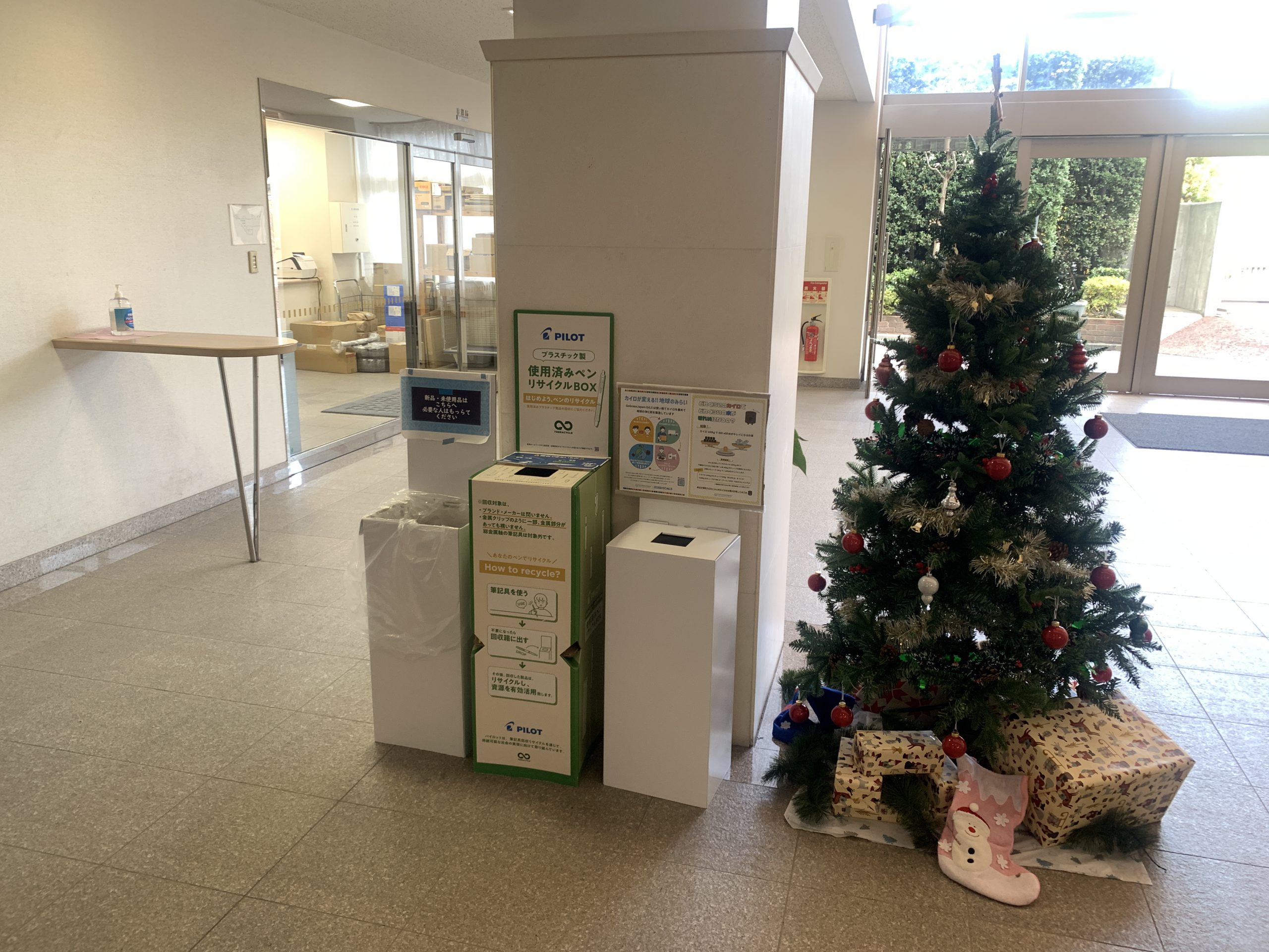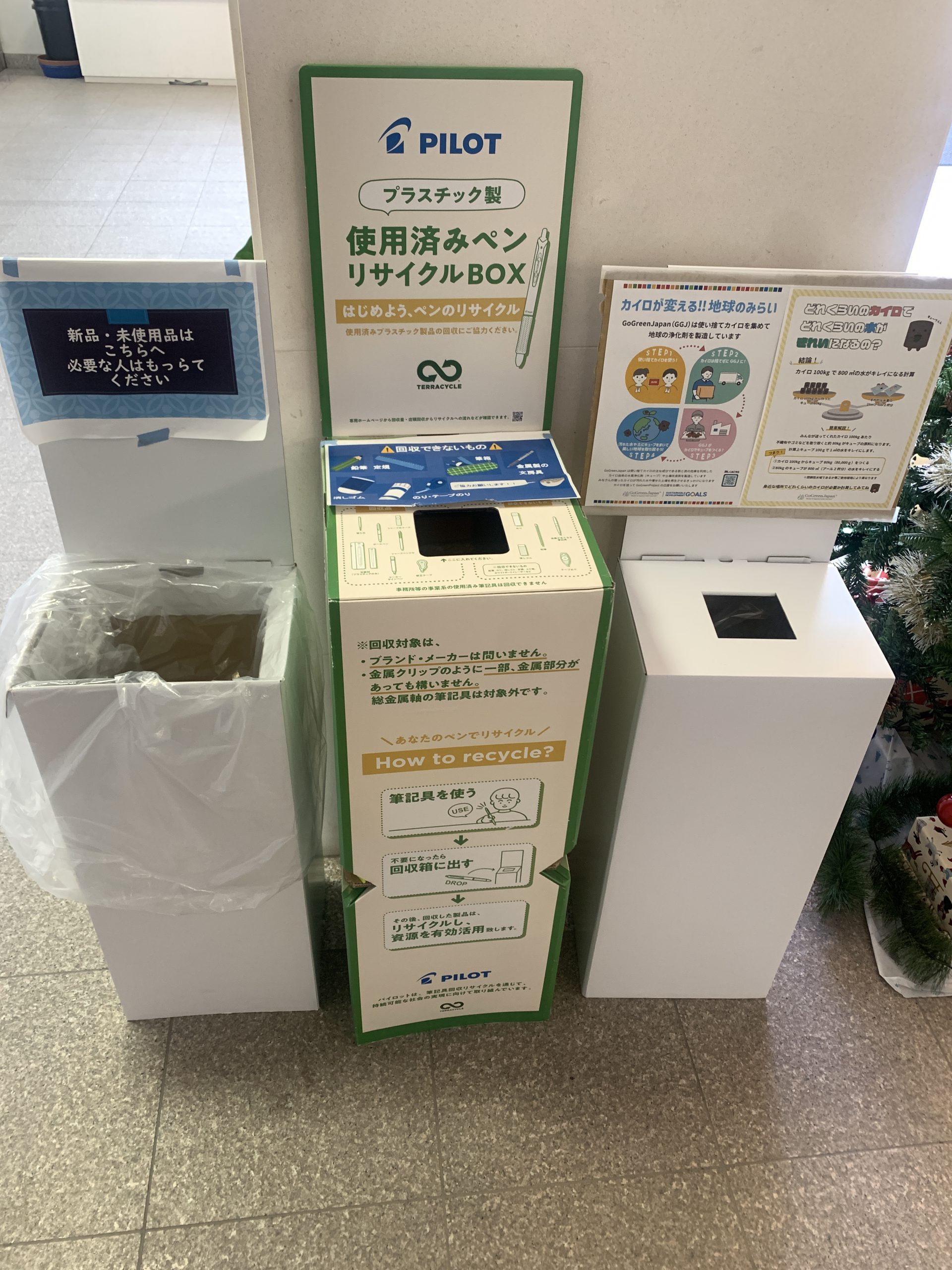 中学3年生の時にはじめた株式会社PILOTの「プラスチック製使用済みペンリサイクル」の回収ボックスを1階の目立つ場所に移動させるのと同時に、新たに「使用済み使い捨てカイロ」の回収を行うこととなりました。回収したカイロは、寄付した先で土壌改良剤・水質浄化剤へと生まれ変わります。