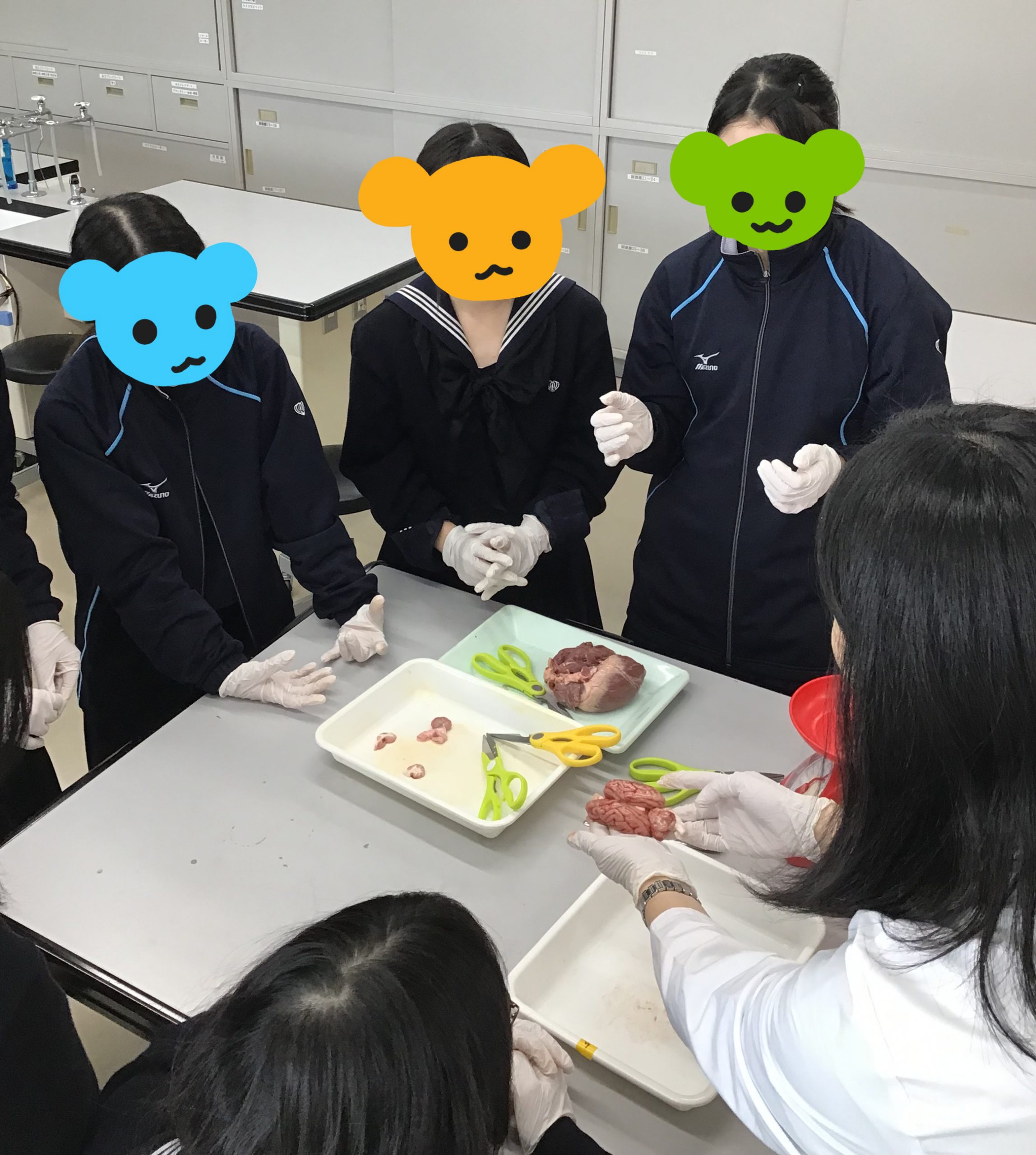 生物の授業では、臓器の解剖・観察を行いました。眼球を解剖して水晶体などを取り出したり、先生の説明のもと肝臓などを観察したり・・・。実物を見ることで理解も深まった様子です。生徒たちは実物教材の貴重さも理解しており、真剣な眼差しで取り組んでいました。