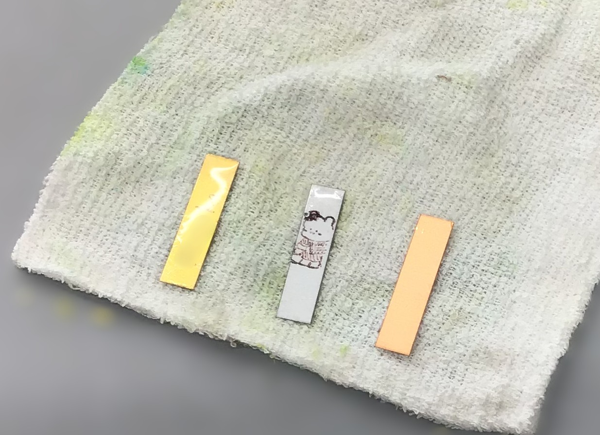 銅板を亜鉛メッキし、加熱して黄銅に変化させました。🥉→🥈→🥇と色が変化するたびに、歓声が上がりました。マジックで模様を描いたところはメッキされず、黄銅にもなりません。