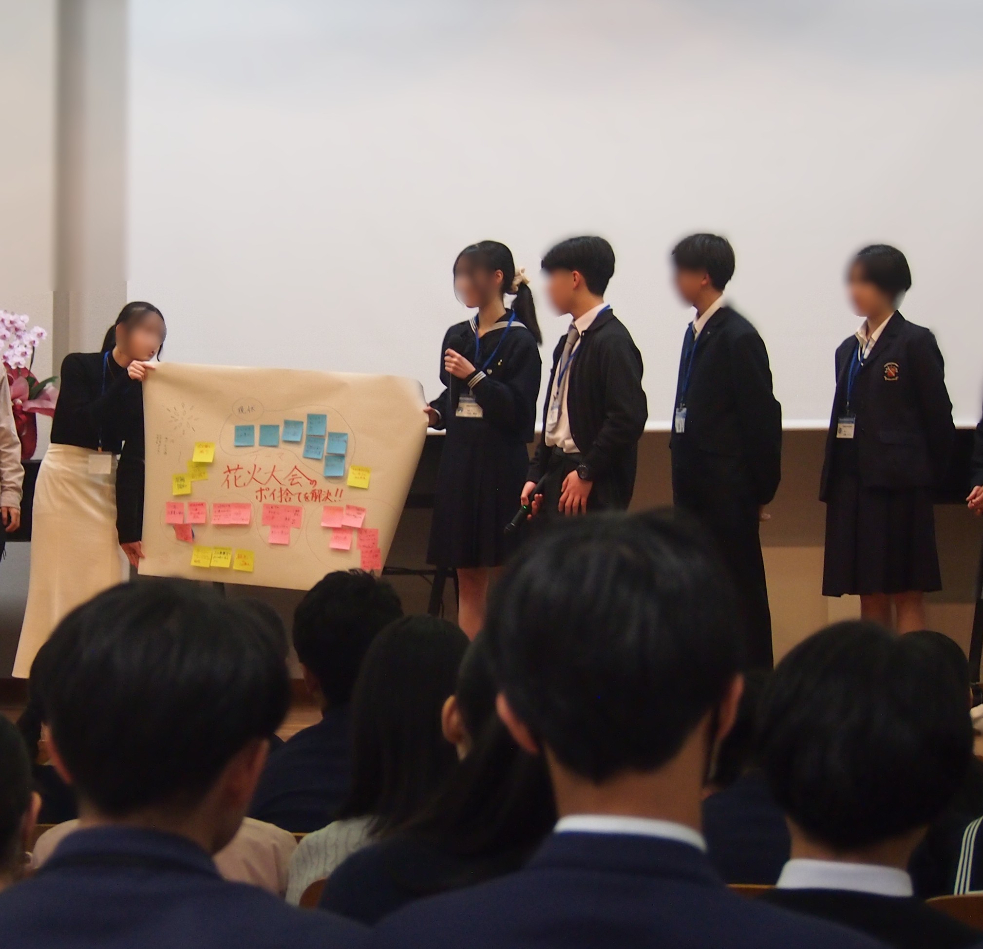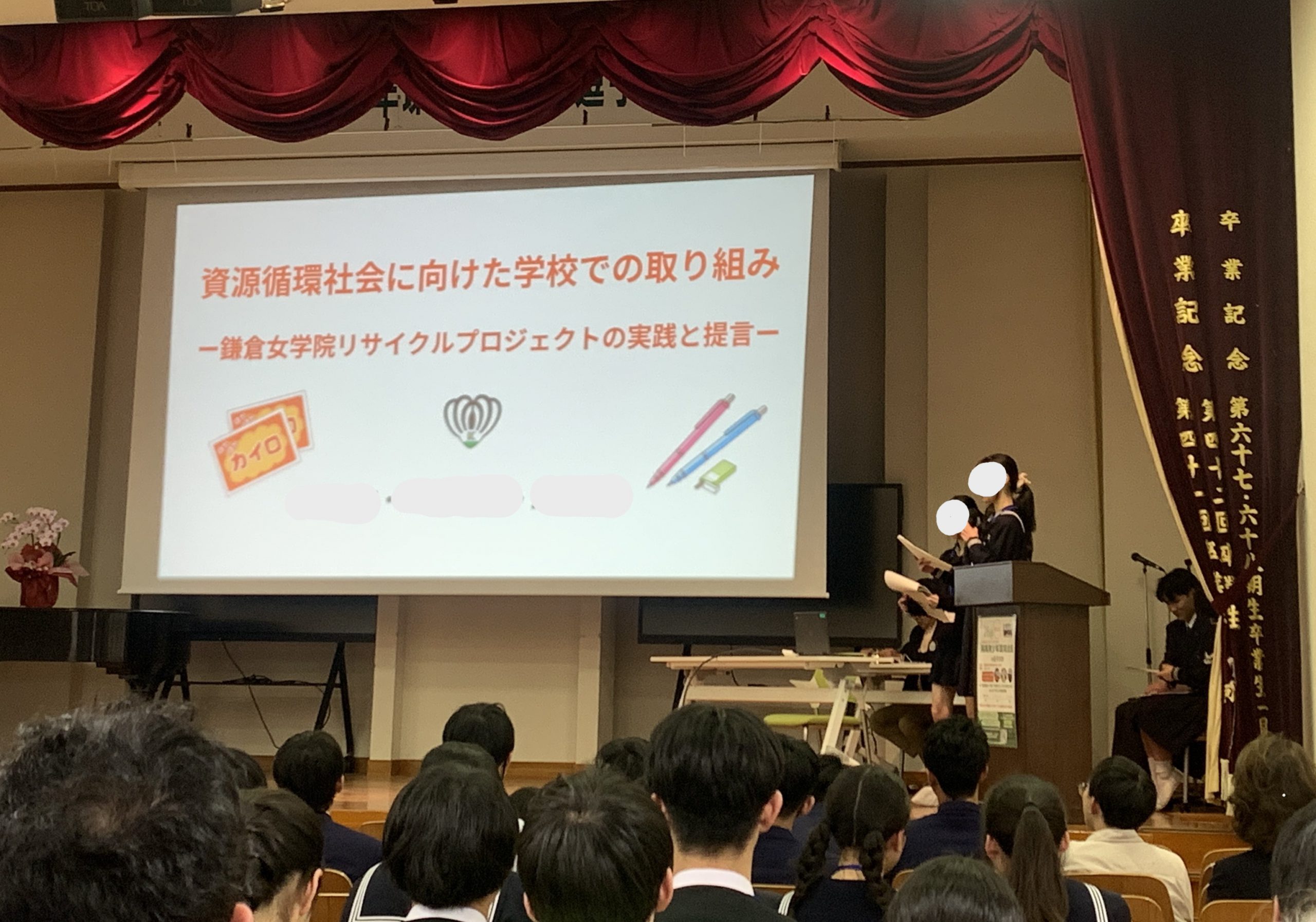 本校チームは、これまで取り組んできたカイロやペンのリサイクル活動の報告や推し活での大量消費に対する問題提起や今後についての提言を行いました。